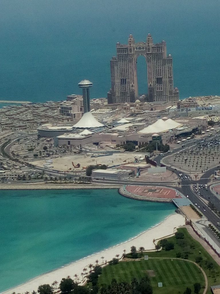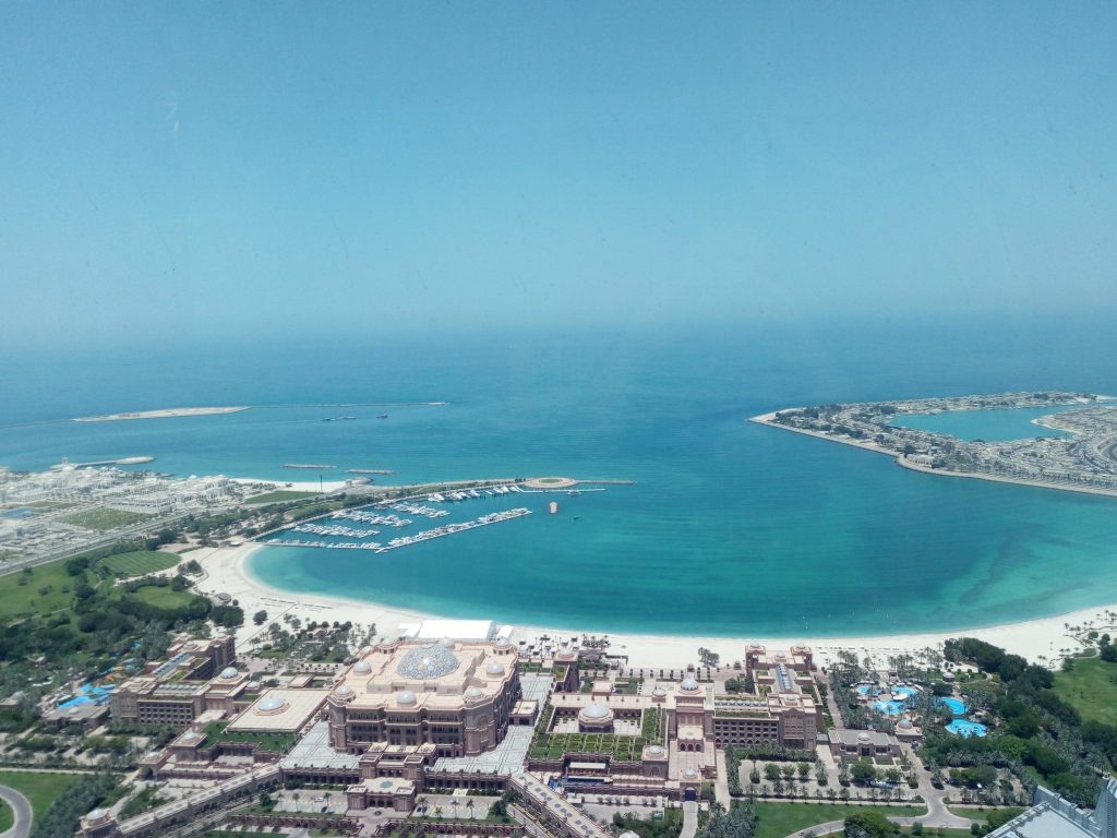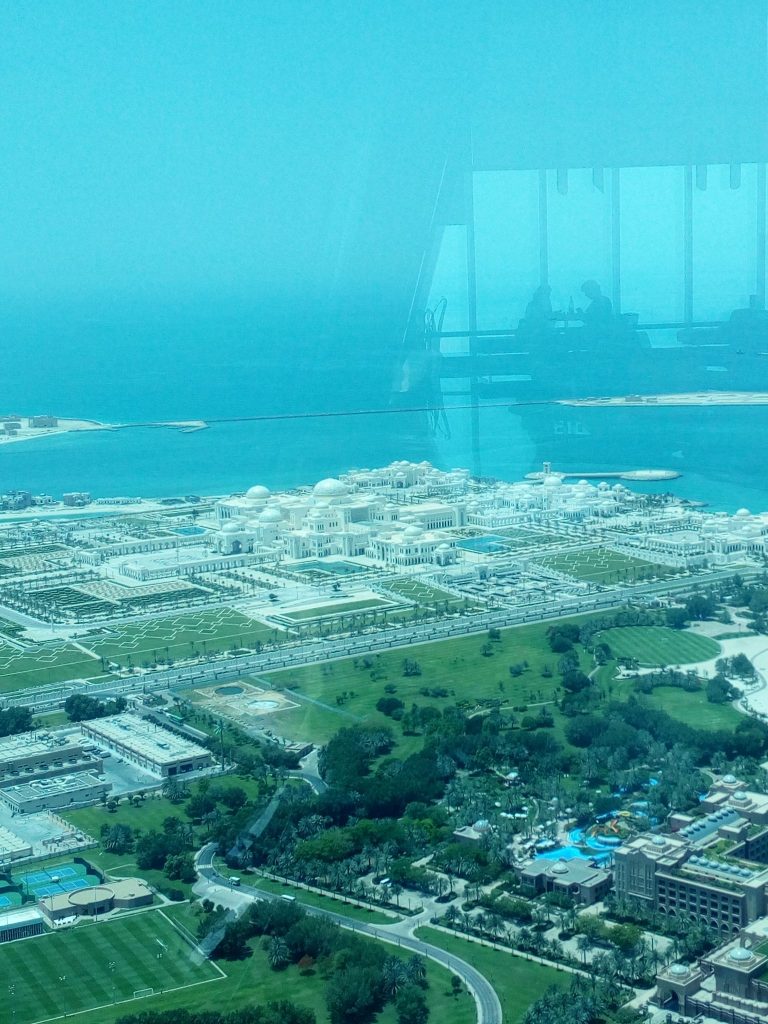 Den som vill se Abu Dhabi från ovan bör bege sig till Etihad Towers och ta hissen upp till Observationdeck at 300 på 74:e våningen. Jag betalade 95 AED för inträdet och då ingick en voucher på 55 AED som kunde användas i cafèt. Så där satt jag med en god avokadosmörgås och njöt av utsikten.