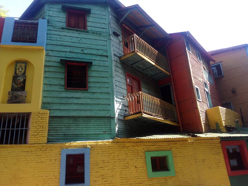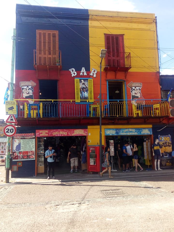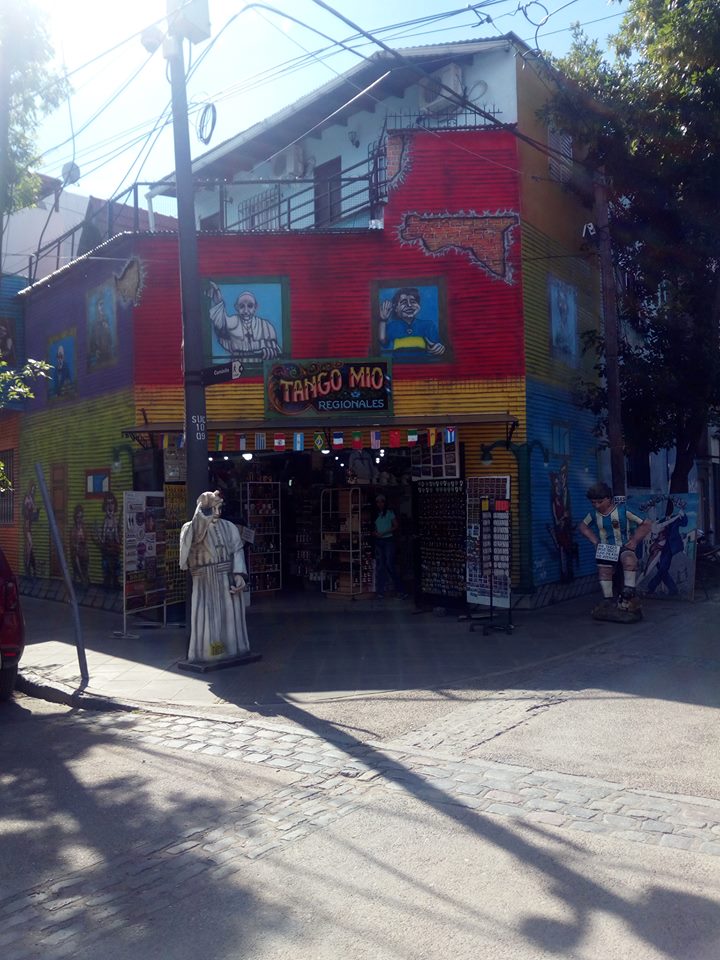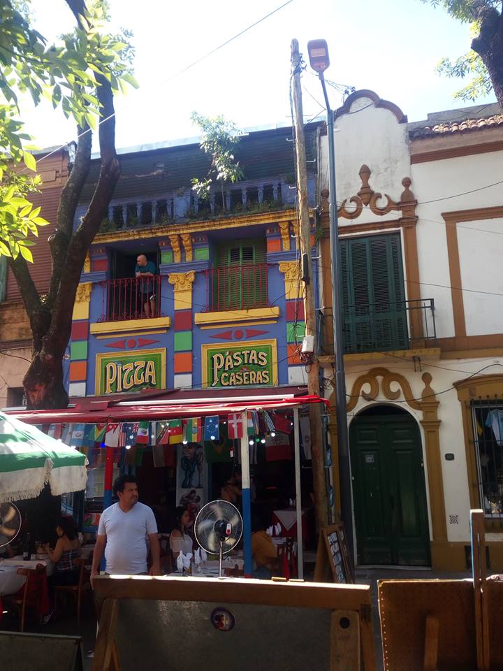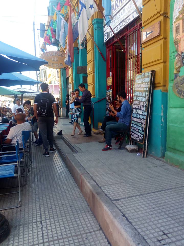 Turistbussen stannar och jag går av för att vandra i denna färgpalett. Efter att ha passerat och fotat flertalet byggnader hör jag tangomusik från en restaurang och stannar till för att titta en stund på paret som dansar. Jag överväger att sätta mig vid den restaurangen men går vidare och hittar strax därefter ytterligare en restaurang med ett dansande par, och ett ledigt bort på en perfekt plats. Jag sitter i lugn och ro med min mat och vin medan jag iakttar parets rörelser och lyssnar på den vackra musiken.