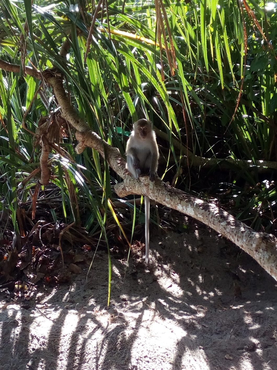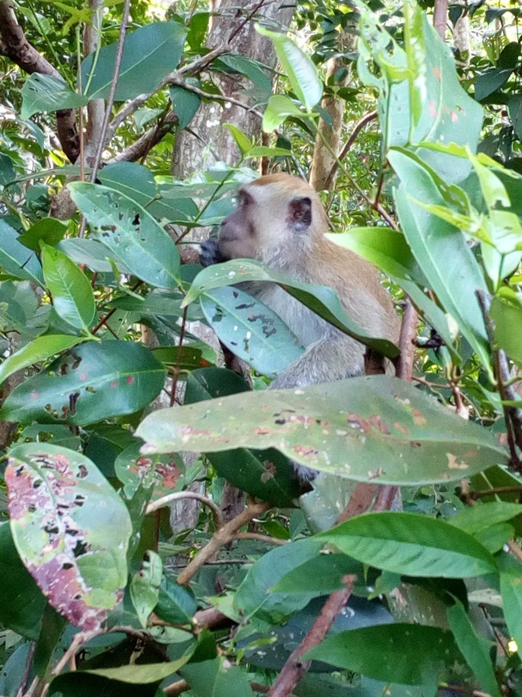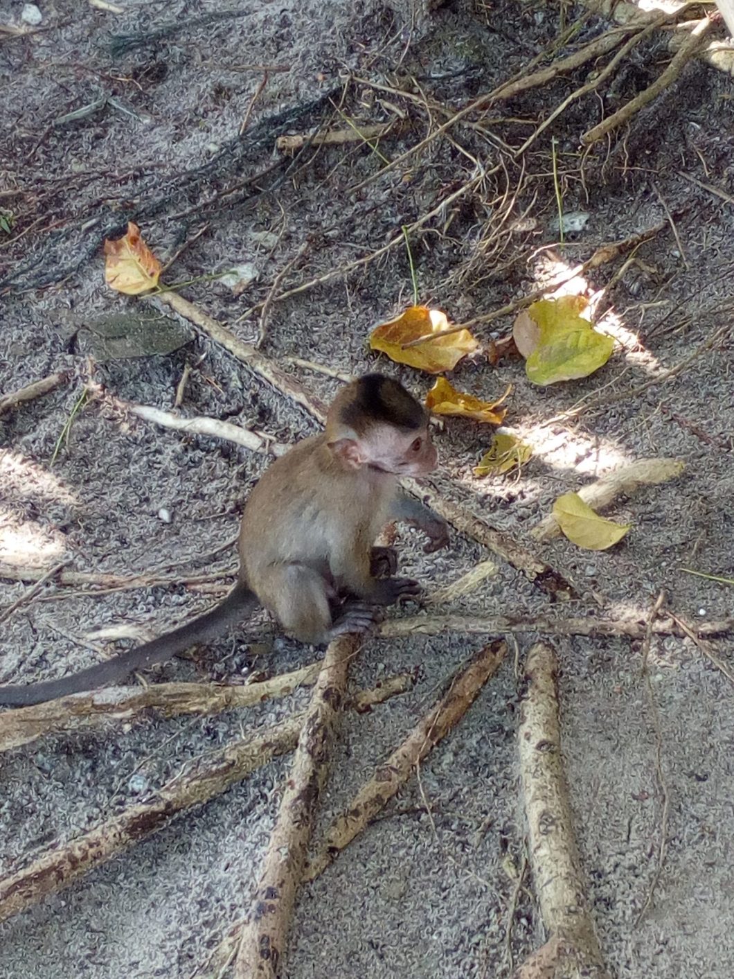 Det finns flera stigar märkta på kartan och jag valde den som gick längs kusten för att minska risken att gå vilse. Jag kom inte långt in innan jag stötte på en flock med apor i olika storlekar.