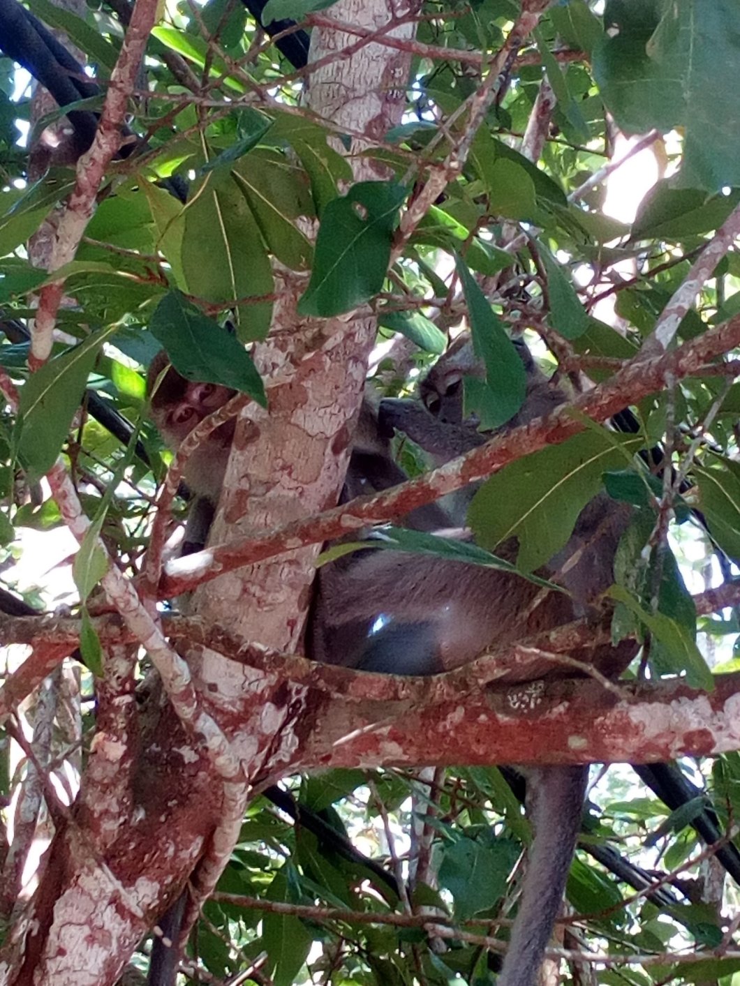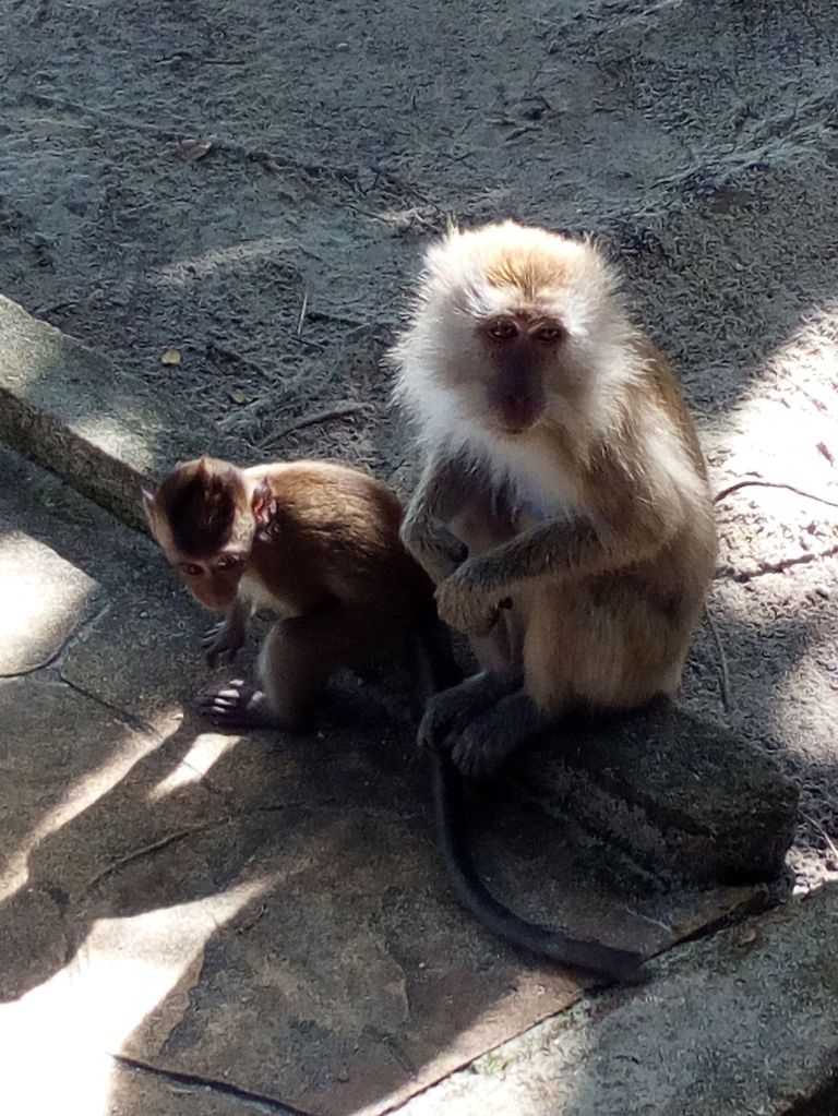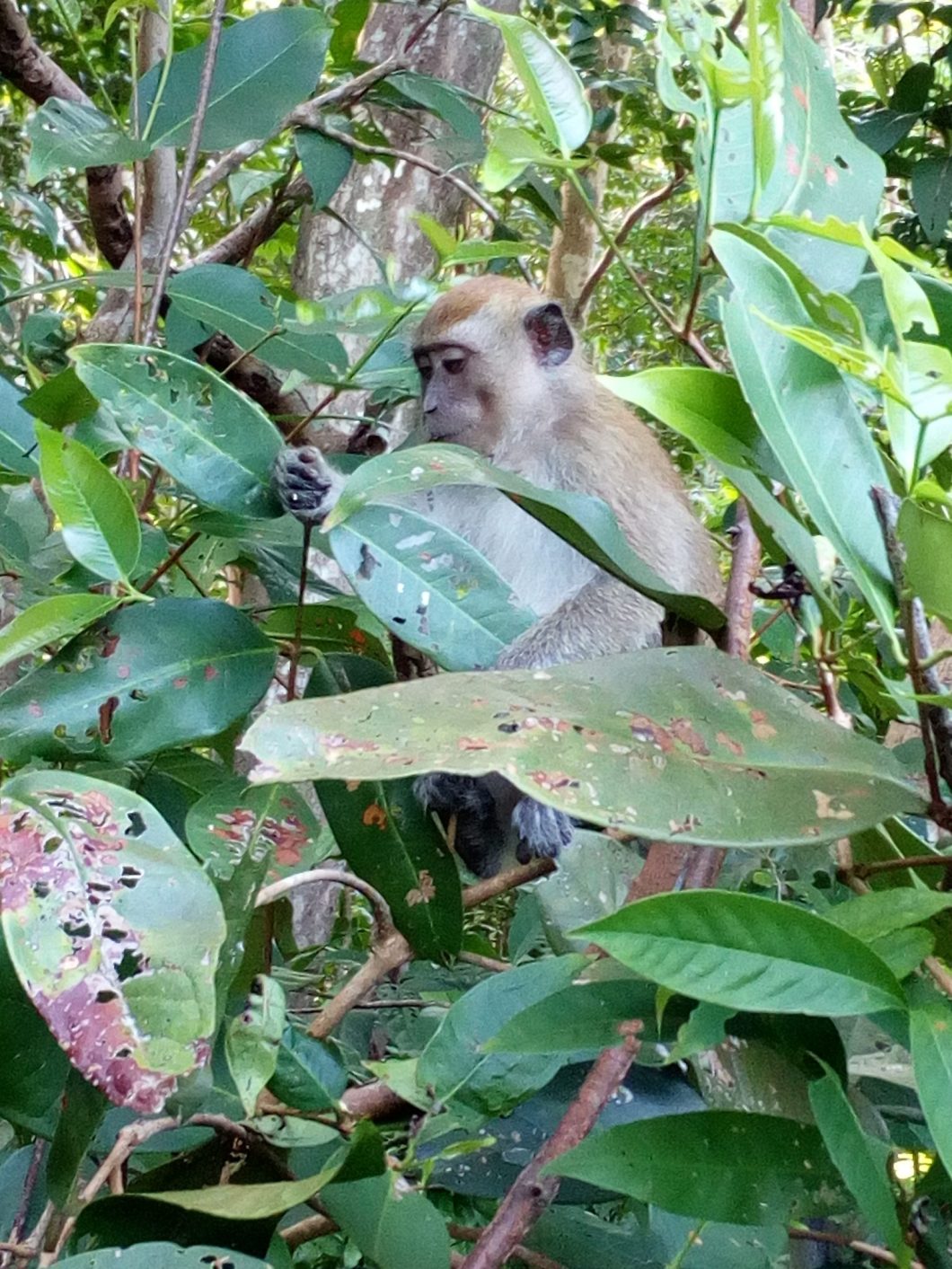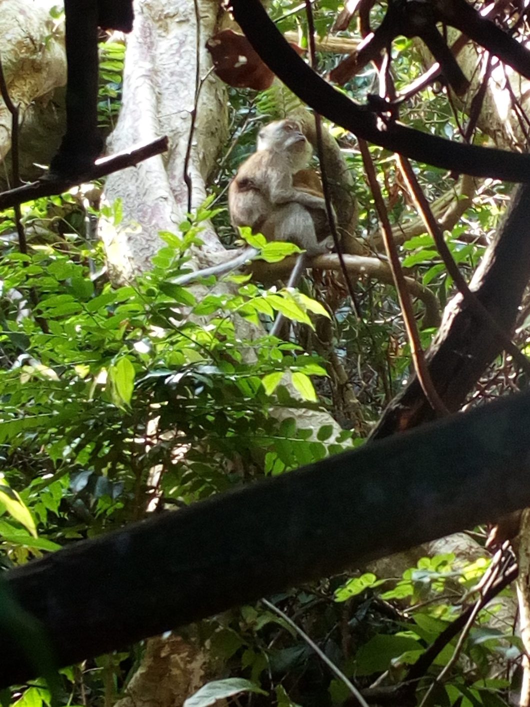 Det finns flera stigar märkta på kartan och jag valde den som gick längs kusten för att minska risken att gå vilse. Jag kom inte långt in innan jag stötte på en flock med apor i olika storlekar.
