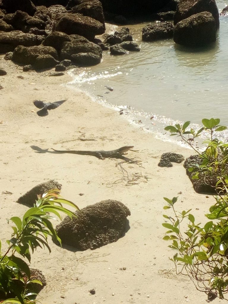 Stigen delar sig och jag tar av till höger och följer kusten omgiven av grönska och hav. Plötsligt ser jag någonting som rör sig i vattnet, två varelser med huvudena ovanför vattenytan. När den ene av dom kommer upp på stranden ser jag att det är två varaner som svalkar av sig.