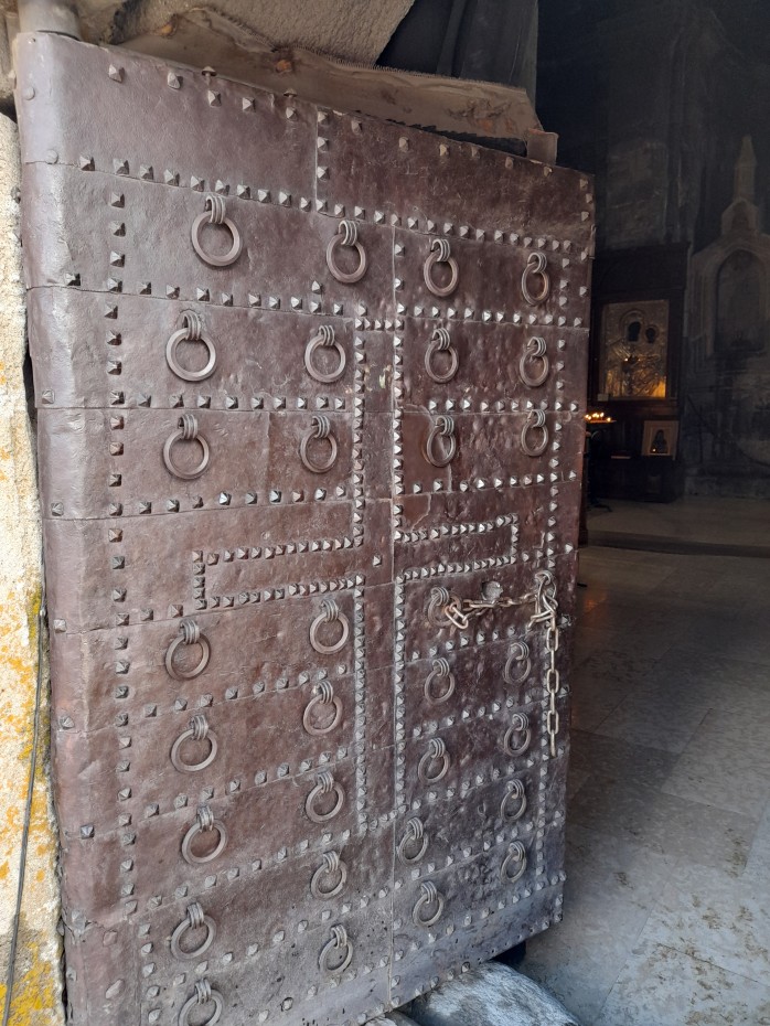 I entrèn till kyrkan låg korgar med saronger samt sjalar. Kvinnor måste nämligen bära kjol samt ha en sjal på huvudet för att få besöka ortodoxa kyrkor i Georgien. Håret behöver inte döljas helt utan jag bar min sjal så den täckte ungefär som en luva gör.