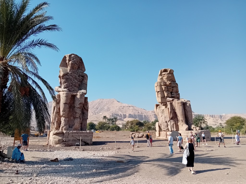På andra sidan hoppar vi in i bussen som tar oss till Memnonstoderna. Två statyer på ca 18 meter som föreställer Amenhotep III och byggdes ca 1300 f.Kr för att pryda ingången till hans gravtempel. Gravtemplet förstördes gradvis p.g.a översvämningar men statyerna står alltså kvar än idag.