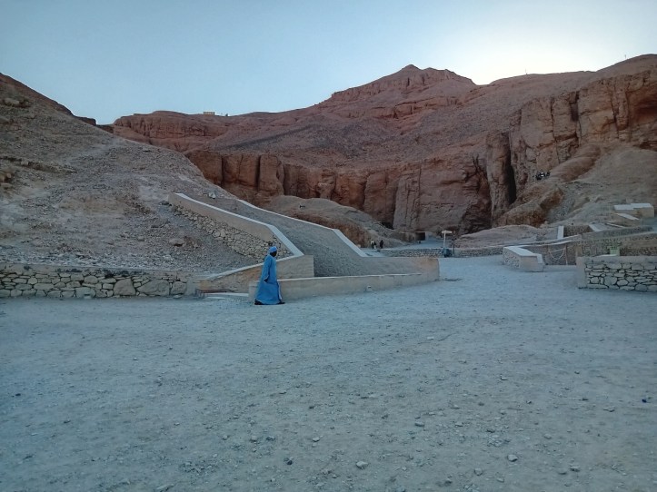 Solen börjar sakta gå ner och kastar ett vackert ljus över bergen när vi når fram till gravplatsen Konungarnas Dal. Dom som vill får köpa en entrébiljett till Tutankhamons grav vilket ska betalas med kort, något jag insåg på morgonen precis när bussen skulle komma. Som tur är för mig ingår ändå tre gravar i den biljett som vi får av vår guide. Så det ska nog bli ett intressant besök ändå. Vi körs upp till gravarna av dessa fordon.