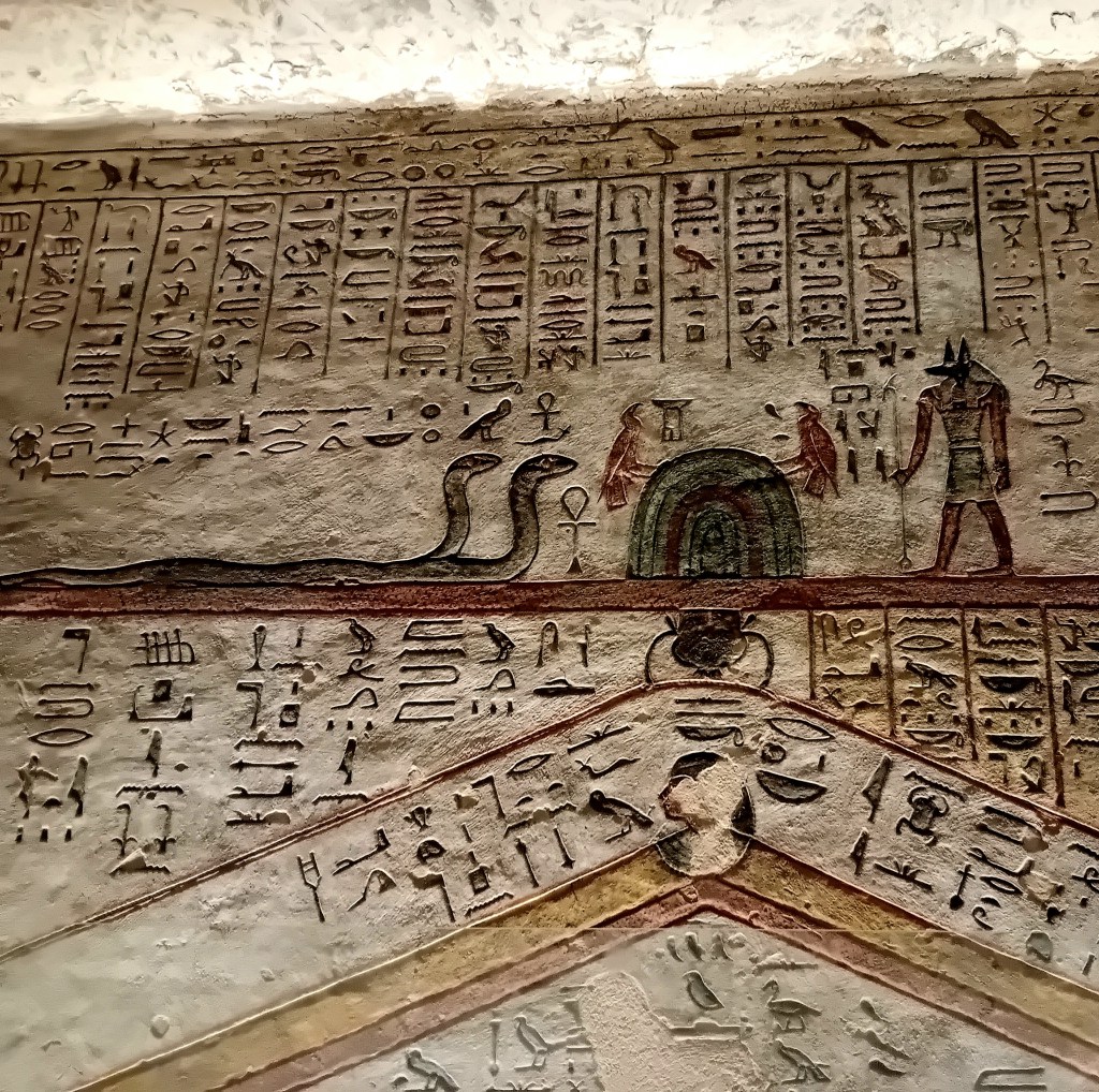 Den första graven som jag besöker tillhör Ramses III och är en av dom största här i dalen. Här noterar jag den ibis-hövade guden Thot som sades vara den som nedtecknade domslutet över människans liv när det var dags att ställas till svars för sina begågna handlingar.