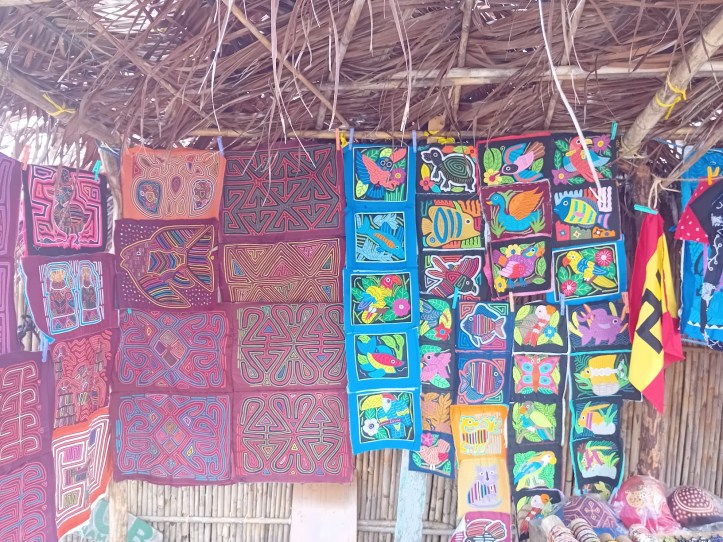 Vi lägger till vid en brygga på ön Nugnudub där det finns kanoter, ett par hängmattor uppspända över vattenytan, en bar, toaletter och en liten shop där Guna-folket säljer sitt hantverk.