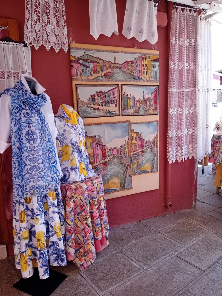 Murano har sin glastillverkning. Burano däremot är känt för sin spets som tillverkas för hand med nål och tråd. Då det är tidskrävande blir priset därefter. Men det kostar ju inget att beundra mästerverken, och dom andra vackra tingen i butikerna.