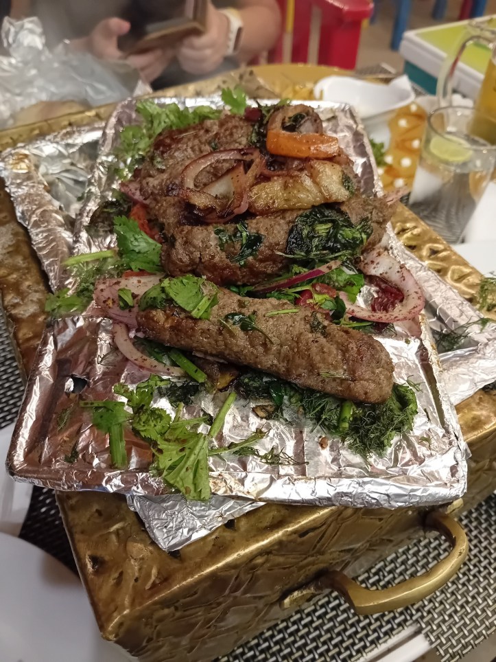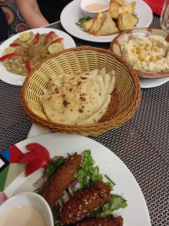 Mörkret lägger sig över Hurghada och vi åker ner till marinan som vi går längs för att välja en restaurang. Vi beställer in förrätter som vi delar på och var sin huvudrätt. Jag beställer lammfärsspett och är väldigt nöjd med mitt val.