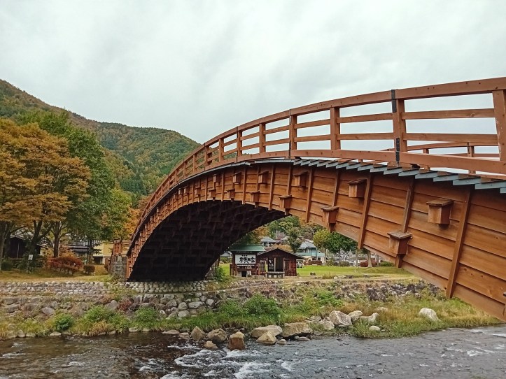 Efter 25 minuters tågresa från Shiojiri kliver jag av på den lilla tågstationen i Narai. Jag väljer att inte gå in i staden direkt utan går istället ner mot floden där jag möts av vackra höstfärger och Kiso-no-Ohashi bron. Därifrån går jag in till staden och dess traditionella träbyggnader från Edo-perioden.