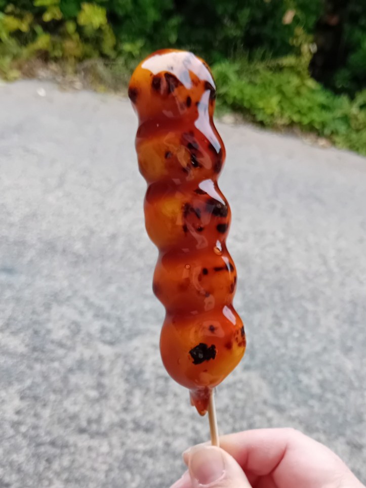 Innan fortsatt promenad genom staden stannar jag för att provsmaka mitarashi dango. Risdumplings täckta med en delikat, söt sojasås. Som tur är väljer jag att äta det ute, för jösses vad sås det droppar. Jag reser mig från bänken, lämnar fläckarna av sojasås på asfalten och vandrar vidare längs gatorna.