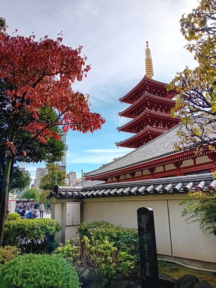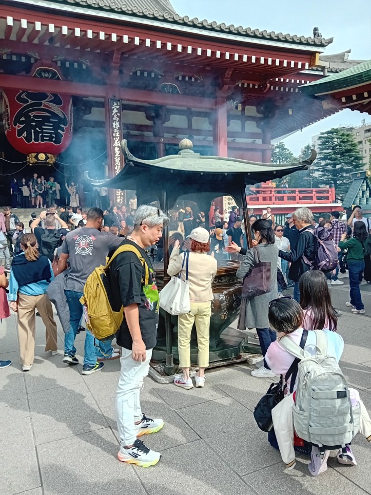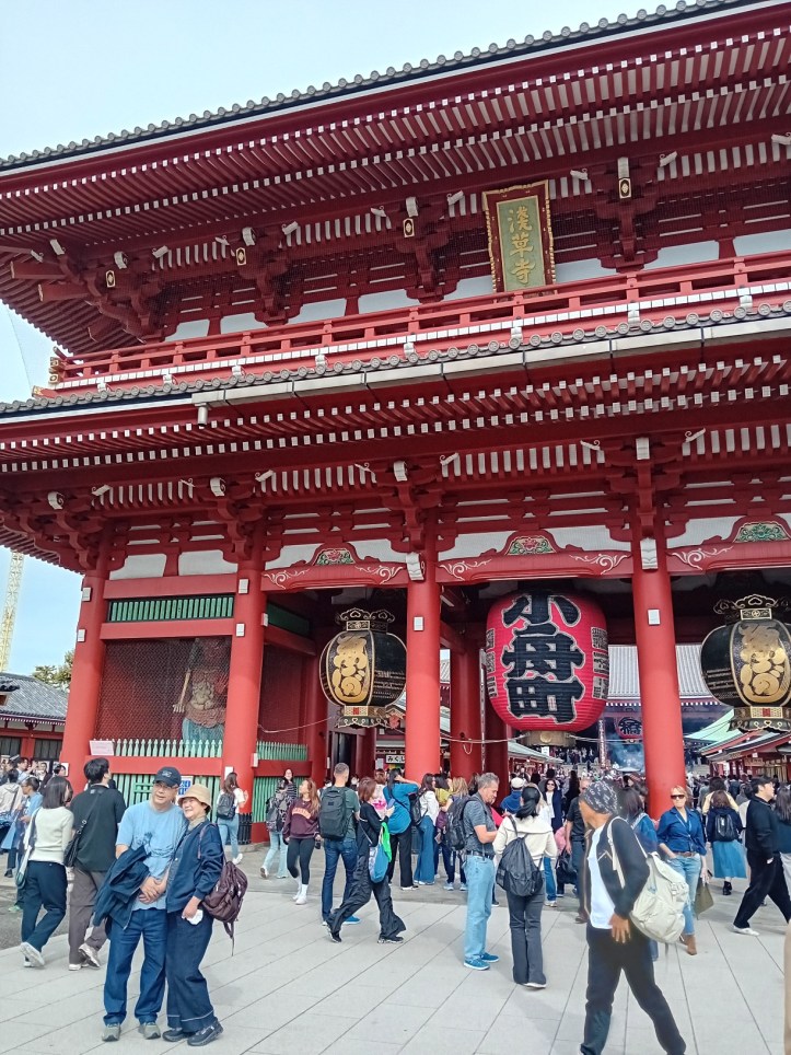 Jag närmar mig Sensoji-templet och inser att det är en stor kontrast till templet jag besökte i förra inlägget. Det var nästan tomt och fridfullt, här är det fullt av folk och souvenirbutiker och matstånd kantar gatorna. Jag kommer fram till porten där det hänger en stor papperslykta som pryds med tecknet för åska. På var sin sida av den står gudarna Fujin och Raijin, vindens respektive blixtens gud.