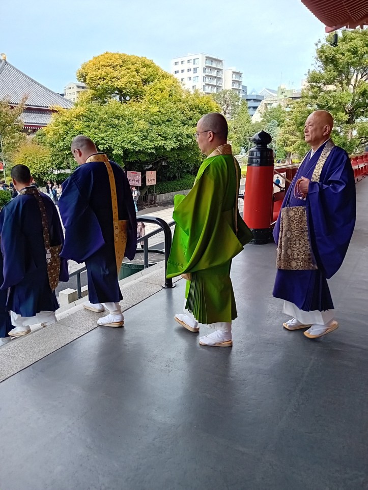 Ut kommer vackert klädda shinto-präster och går på led till en annan byggnad där dom samlas för att be. Där är det inte tillåtet att fotografera, vilket jag respekterar.