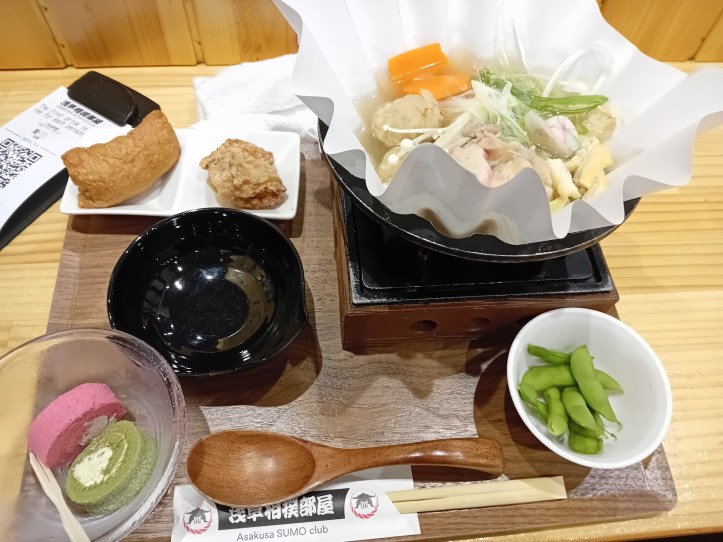 Chanko-nabe, kycklinggrytan som sumobrottare ofta äter, är lite väl smaklös för mig, men värmer och mättar mig ändå. Förutom den serveras vi friterad kyckling, en bit med sushiris och tofu, bönor samt dessert, varav den ena till min glädje smakar grönt te.
