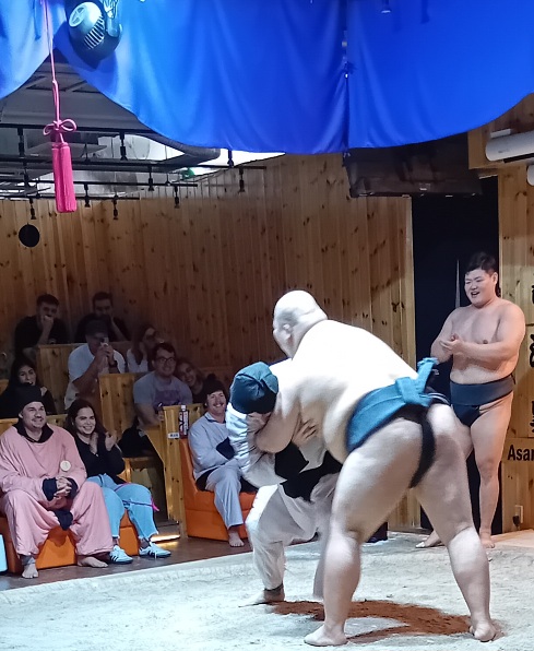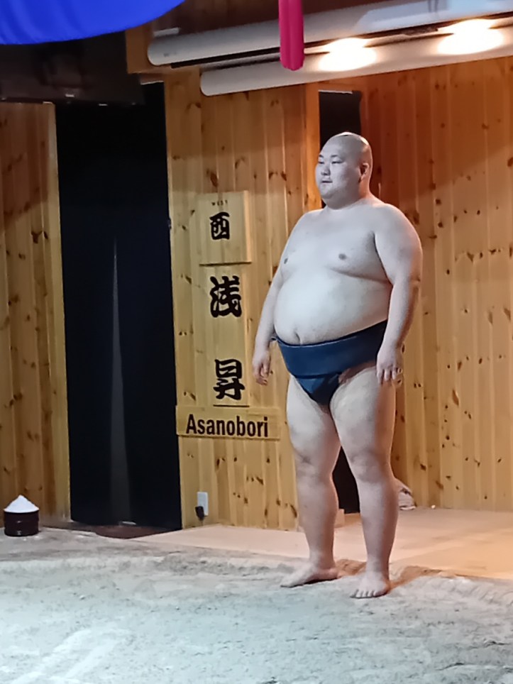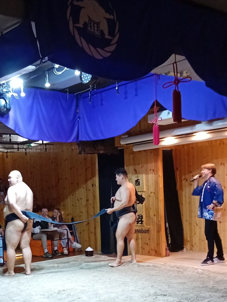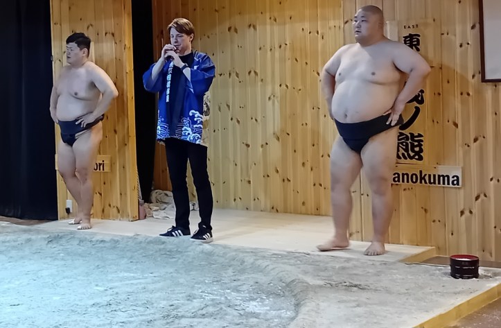Efter det är det dags att välkomna brottarna Asanobori och Asanokuma. I showen deltar pensionerade sumobrottare och den blandar fakta med humor. Så detta är inte något för den som vill uppleva mer seriös sumobrottning, utan det är för den som vill lära, heja och skratta. Min sida ska heja på Asanokuma ikväll. Som ni ser är den traditionella tofsen borta hos båda. När en sumobrottare pensioneras genomförs en ceremoniell avklippning av tofsen.