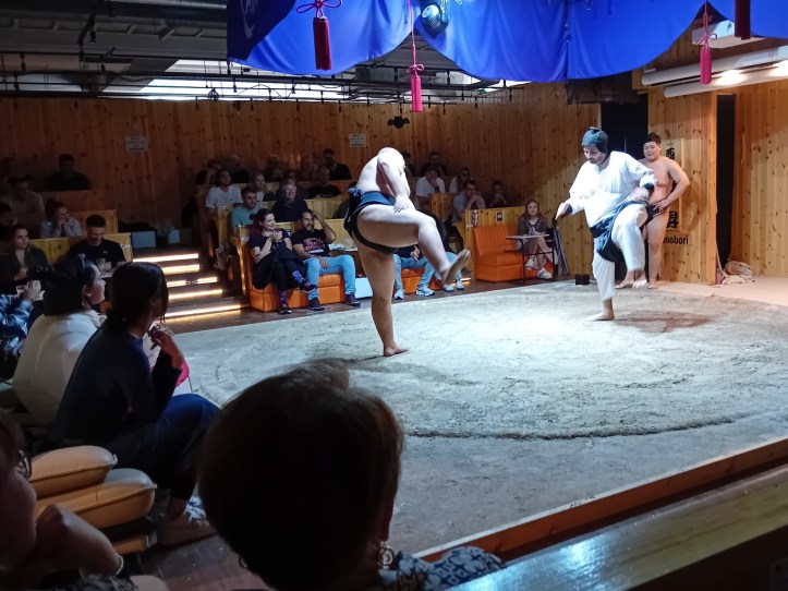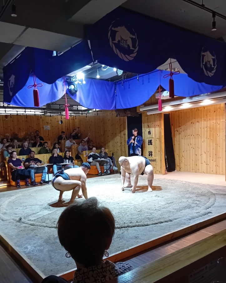 Den sena starttiden har gjort att jag haft hela dagen på mig att besöka Narai och Shiojiri som jag har skrivit om tidigare. Det utlovade regnet som hållit sig undan under dagen började komma på väg tillbaka till Tokyo. Från tågstationen tar jag metron bort till Asakusa, och när jag kliver upp på marknivå igen ser jag att regnet vräker ner. Perfekt inomhus-väder. Med mitt paraply som skydd tar jag mig till Asakusa Sumo Club. Där blir jag och resten av deltagarna placerade vid våra platser och serveras måltiden som ingår i turens pris.