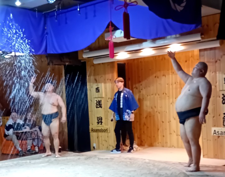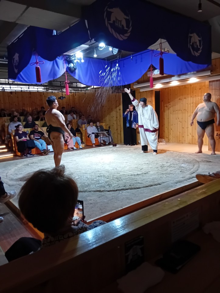 Asanokuma berättar att han började träna sumobrottning redan som 6-åring och att han tränar 6 timmar varje dag. Vi samlas även runt ringen för att ta var sin näve salt och kasta det, tillsammans renar vi ringen.