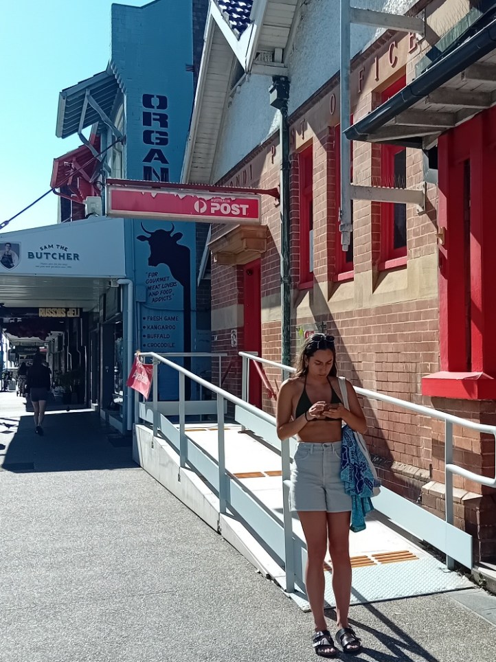 Jag ”fuskar” efter mitt besök vid aboriginernas hällristningar och tar bussen längs stranden och uppför den långa backen för att spara på krafterna i värmen. När jag kommit en bit på gatan med dom söta husen hoppar jag av och går tillbaka i riktning mot stranden. Efter lite fotande får jag syn på en supermarket där jag handlar på mig lite smått och gott. Både nyttigheter som en smoothie och mindre nyttiga, men ack så goda, fikabröd.