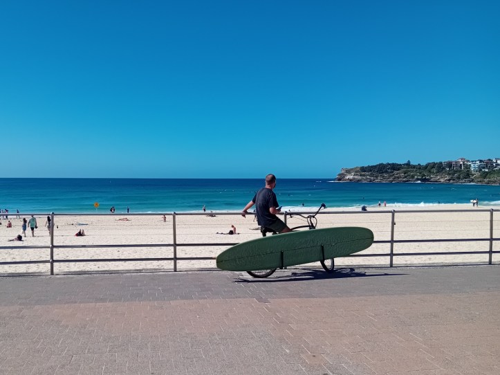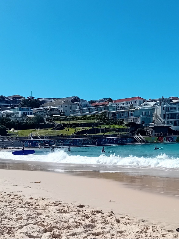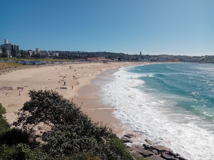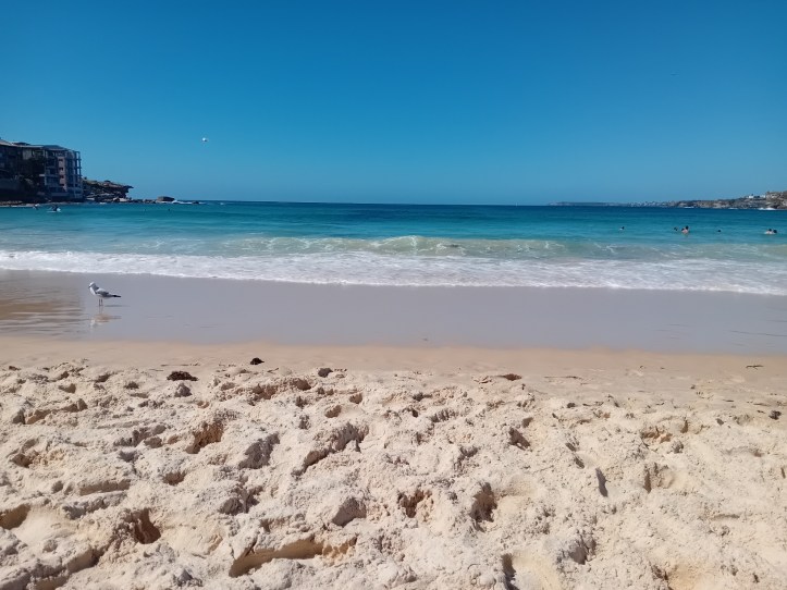 Dom höga, kraftiga vågorna som stundtals kommer gör att jag håller mig ganska nära stranden, med vatten halvvägs upp på låret ungefär. Jag har stor respekt för vatten och vill inte riskera att knuffas omkull av en våg och dras ut. Min försiktighet gör att det blir några sköna och säkra bad. Tillsammans med god mat på stranden, solande och musik i öronen spenderas ett par fantastiska timmar innan jag åker tillbaka mot centrala Sydney.