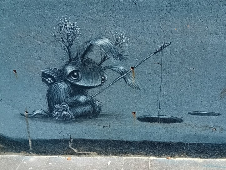Street-art hihihi söt liten varelse, kanin eller, som metar. Vilken fin strand härliga vågor som skummar, bra att du fick njuta av sol bad. Tror att banderollen med 12, ändå syftar på dödsoffren. Ha det fint.