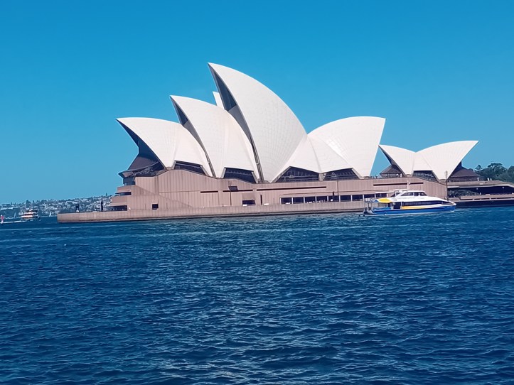Min promenad från hotellet har tagit mig till Sydneys hamn. Framför mig båtar och ett stort kryssningsfartyg som väntar på sina passagerare. Till höger folkvimlet som rör sig förbi barer, restauranger, souvenirbutiker och glasstånd för att komma ut till operahuset. Jag älskar ”höger” och tar den vägen flera gånger under min resa.