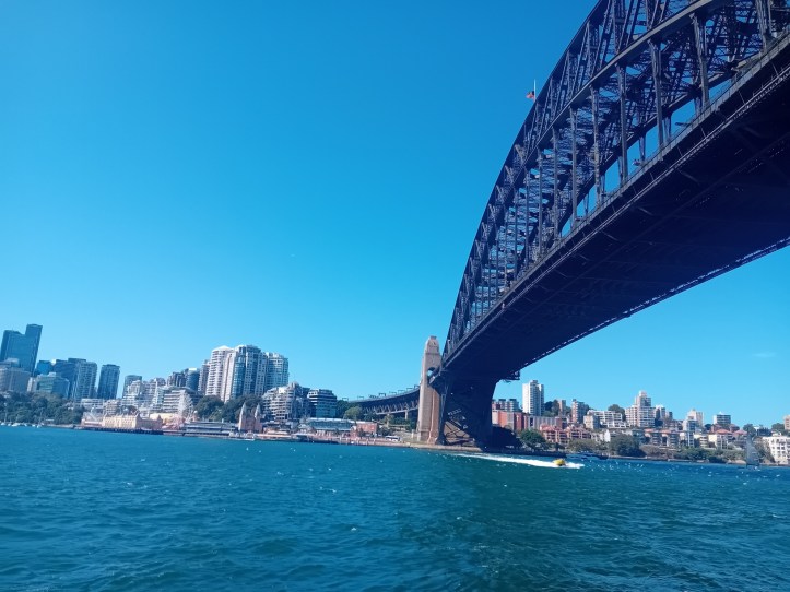 Slutligen når jag Sydney Harbour Bridge som tar sig över till Milsons Point. Under den färdas båtar, på den rör sig fotgängare, cyklister, bilar och tåg. Och den som vågar kan ge sig ut på en Bridge-climb där en guide tar med gästerna längs brons bågar som på sin högsta punkt är 134 meter över vattnet.