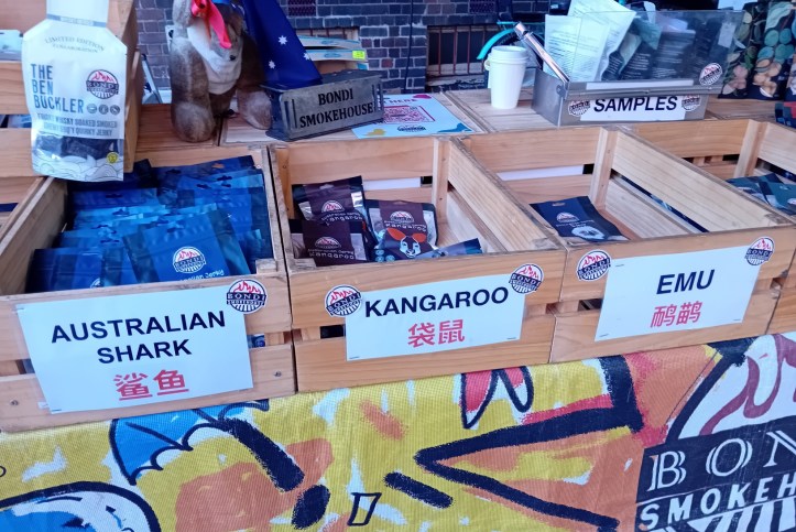 Jag går runt bland hantverk och konstverk. Känner dofterna av paella, japansk mat och allt annat som erbjuds. Här kan den som vill smaka på australiensiska djur som känguru, i torkad variant eller köpa en grillad köttbit från ett av stånden.