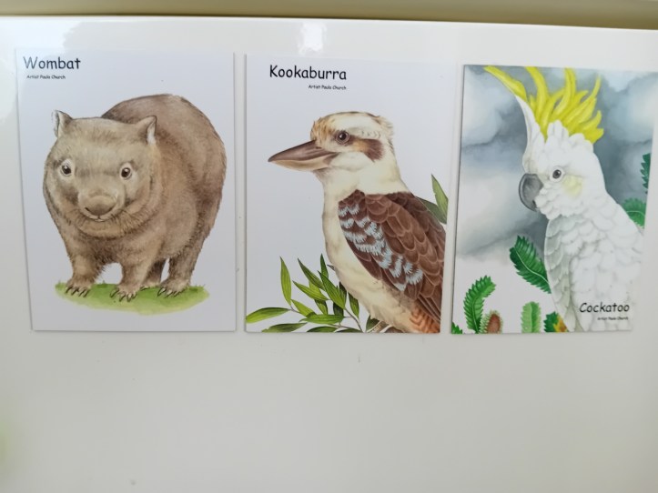 Mina ögon fastnar på en magnet med en kookaburra. Ni kanske minns att en sådan snodde åt sig en del av min bakelse?