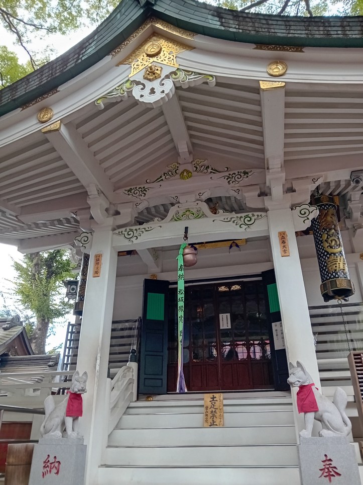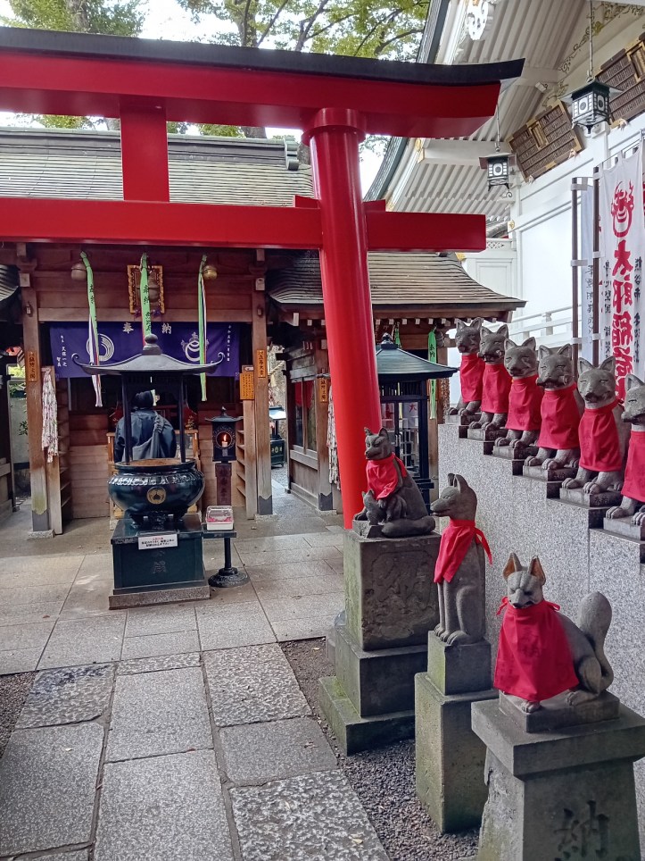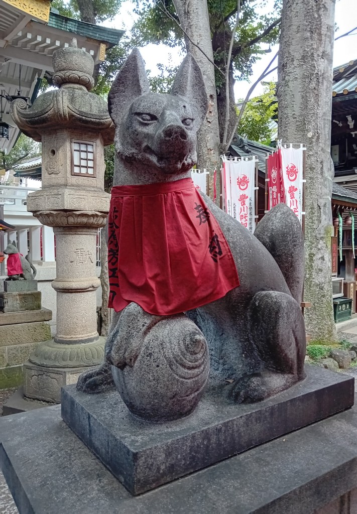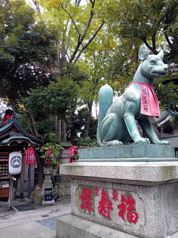 Det här templet är tillägnat Inari. En gudom för bland annat jordbruk, handel, fertilitet, smide och välstånd. Vid tempel tillägnade Inari finns det ofta rävstatyer då rävar, kitsune, ses som Inaris budbärare. Vid detta tempel finns det mängder av dom, vilket jag tycker är väldigt charmigt.