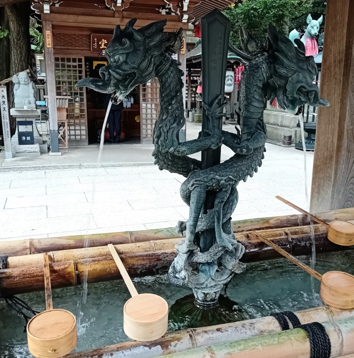 Innan man besöker ett shinto-tempel ska man utföra en reningsritual. Den görs vid en vattenfontän likt denna. Med hjälp av en skopa hälls vatten över en hand åt gången. Sedan hälls vatten i handen. Det vattnet används för att skölja munnen.
