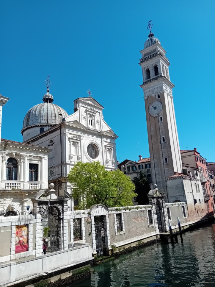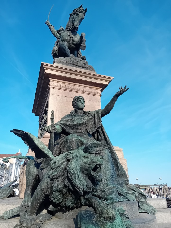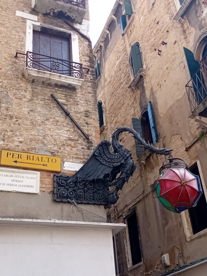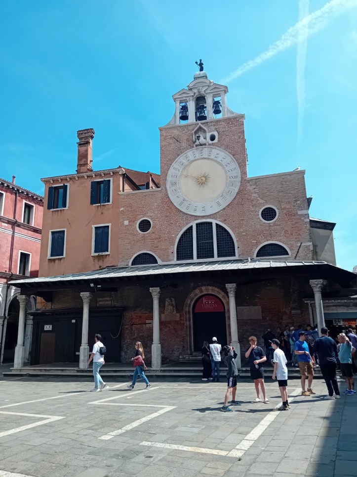 Jag går under det vackra klocktornet som började byggas år 1496. Som på så många andra platser i Venedig syns ett lejon med vingar och en öppen bok, en symbol för Sankt Markus. Ursprungligen fanns där en staty av dogen Agostino Barbarigo men efter att Napoleon intagit Venedig 1797 togs statyn bort av fransmännen som ville radera symboler av tidigare ledare.