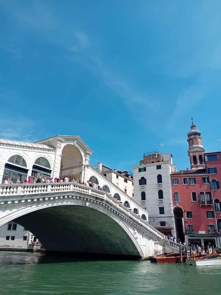 Jag följer skyltarna som leder mig till Rialtobron som invigdes år 1591. Det är folktätt så jag väljer att inte stanna alltför länge på bron, bara för att ta ett kort innan jag tar mig vidare till andra sidan kanalen och sätter mig ner med en drink.