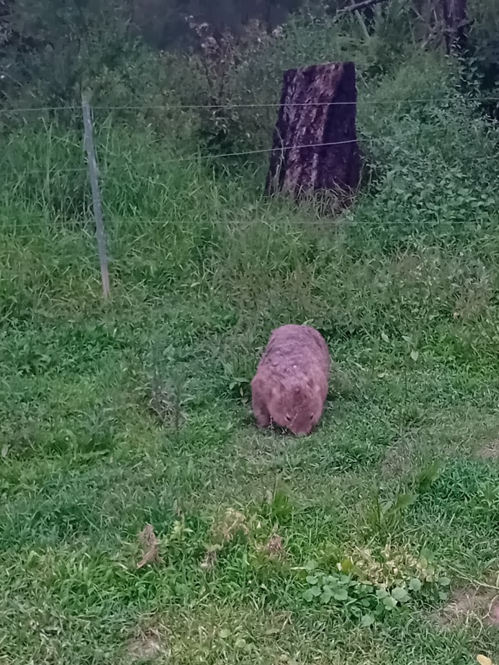 Vombater är nattaktiva djur, så därför har vi behövt vänta in skymningen för att se dom. Dom gräver tunnlar och bohålor i jorden där dom vilar dagtid för att sedan komma upp och spendera 3-8 timmar med att äta gräs.