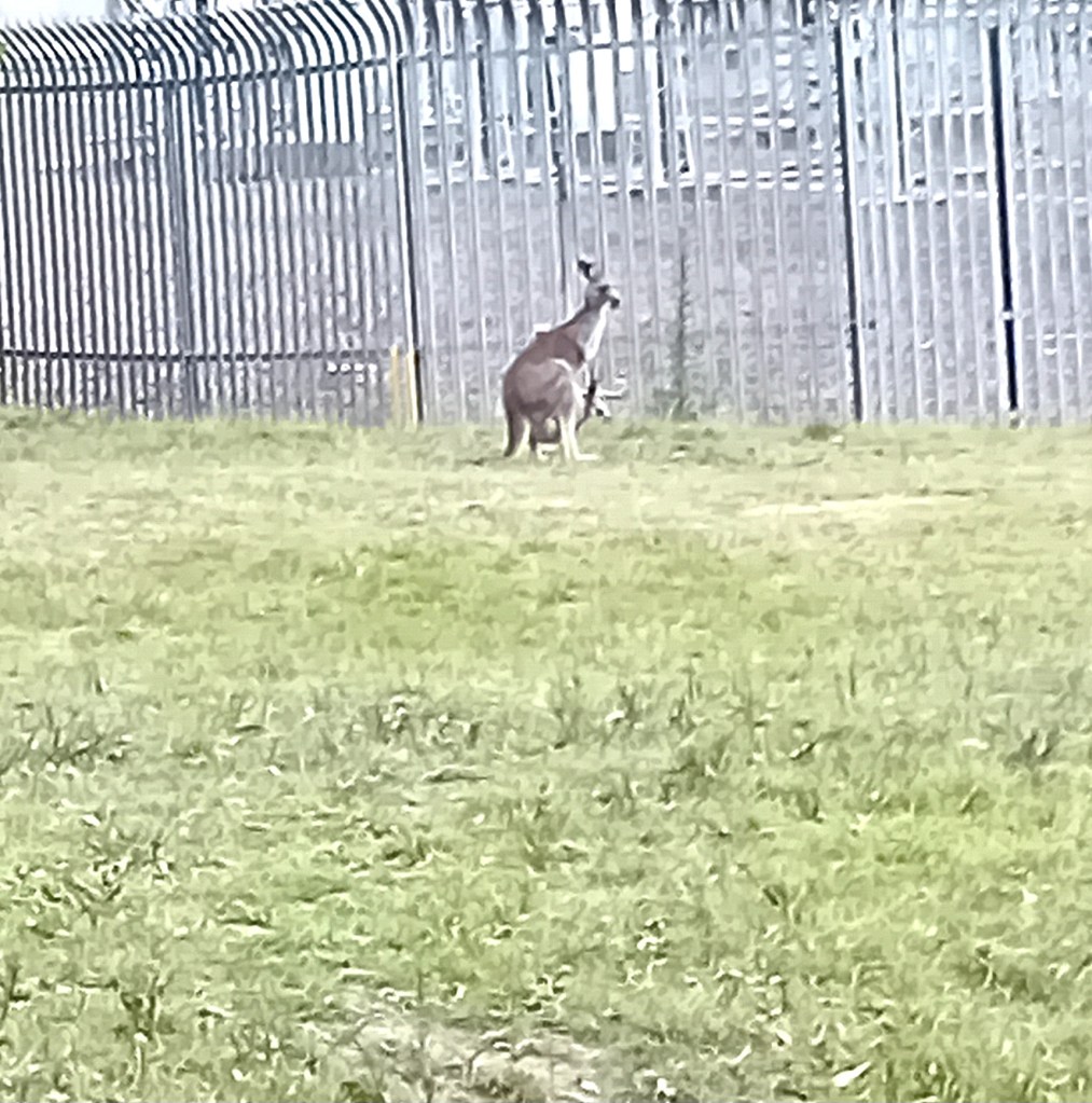 Nu är det dags att äta middag och vänta in skymningen då fler djur är i rörelse. Men redan nu ser vi kängurus, om än på långt avstånd vilket ni nog kan ana av den suddiga bilden. Det finns en gräns för vad en mobilkamera kan åstadkomma genom ett bilfönster, men vem kan motstå ett foto av en kängurumamma med sin unge i pungen?