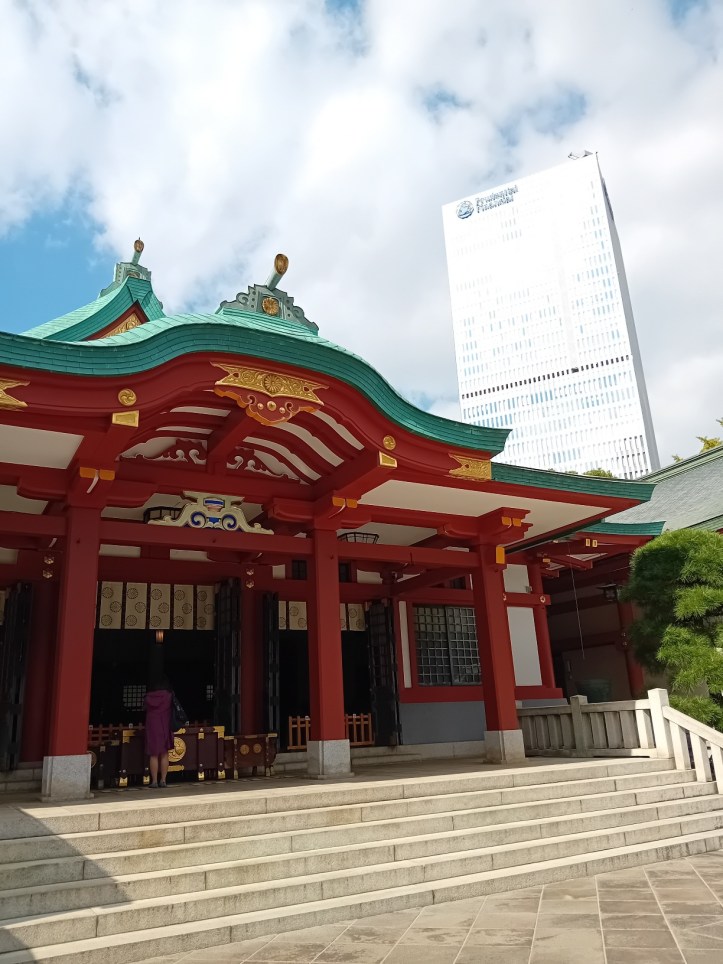 Helgedomen byggdes 1478 innaför Edoslottet för att skydda det mot onda andar. Edo är för er som inte minns det gamla namnet på Tokyo. År 1604 flyttades den ut i staden för att folket skulle ha åtkomst till helgedomen och kunna be där. 1657 drabbades Edo av en katastrofal brand. Starka vindar, det faktum att dom flesta byggnader var byggda av trä och papper och gatorna mellan dom var smala gjorde att elden spred sig fort. Under dom tre dagar elden härjade förstördes 60-70% av staden, inklusive helgedomen.